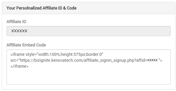 After your request to be a Bizignite Affiliate has been accepted, you will receive embed code for your website (click here to see an example) and a Referrer ID. Both the embed code and Referrer ID are used for tracking. You will issue the Referrer ID for individuals to use during Bizignite registration that do not use YOUR embed code to register.